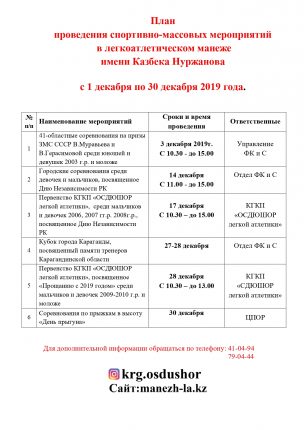 14 декабря в легкоатлетическом манеже им. К. Б. Нуржанова прошло «Первенство города Караганды по легкой атлетике, среди юношей и девушек 2005-2006 г.р. посвященное Дню Независимости». Напрыгались, набегались и наметались сегодня наши спортсмены. Поздравляем победителей и призеров соревнований и желаем вам, как можно больше побед!